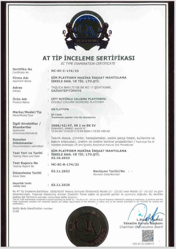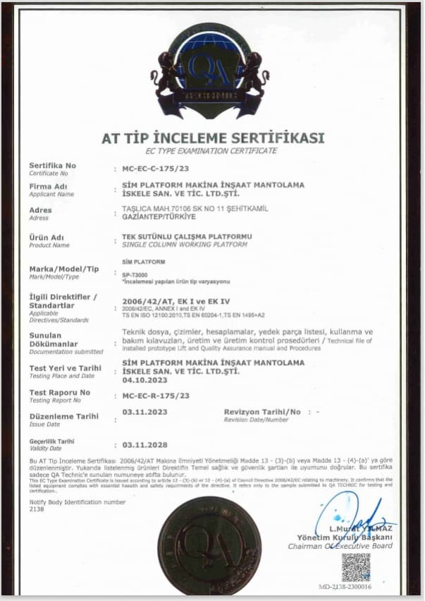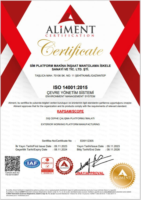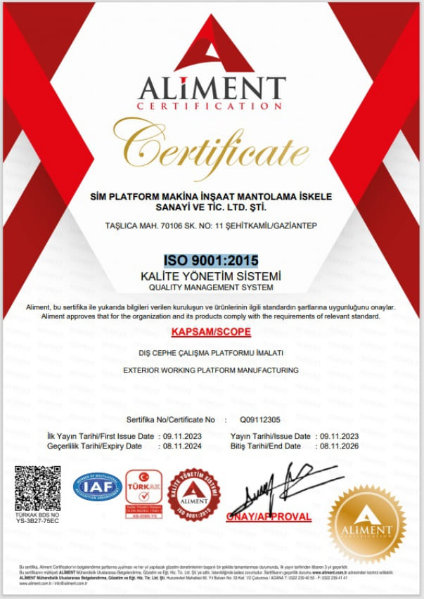 Sertifikayı İncelePlatform iskele sistemlerimizin Avrupa Birliği güvenlik, sağlık ve çevre koruma gerekliliklerine tam uygun olarak üretildiğini tescilleyen sertifikamızdır.